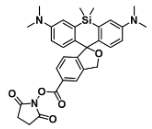 硅-罗丹明是用二甲基硅基替换四甲基罗丹明母核中的氧原子得到的一类具有更长发射波长、更好光稳定性的荧光染料、以及标记时更低荧光背景的荧光染料。SiR 染料最大激发波长 652 nm,最大发射波长 674 nm,处于红外光区;光稳定性好,成功应用于超高分辨成像;在溶液中常处于闭环状态,因而标记时荧光背景非常低。将 SiR 羧酸与各种点击化学接头连接,我们开发了一系列的 SiR-Click 探针,用于生命科学相关研究。