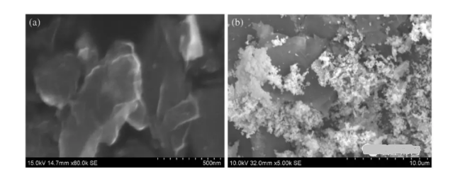 Figure 4. (a)石墨烯和(b)GN-ZnO纳米复合材料的FE-SEM图像。