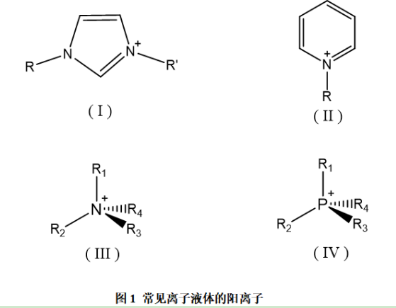 离子液体的类型由其构成的阴、阳离子决定。构成离子液体的阳离子主要有以下四种类型:(Ⅰ)咪唑离子;(II)吡啶离子;(Ⅲ)季铵离子;(Ⅳ)季磷离子(分子结构如图1)。除了上述这些常见的阳离子外,还不断有如胍类离子、吗琳离子、吡唑离子、二吡啶离子等应用。