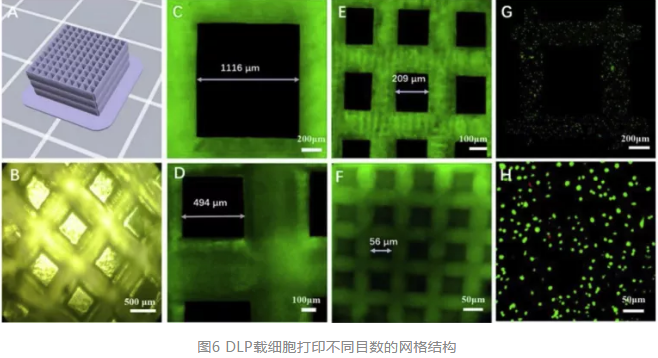 最后,研究人员利用DLP打印技术对CHI-MA进行了精巧结构的构建及载细胞打印,从而证实了CHI-MA水凝胶的打印性能和细胞相容性(图5、6)。