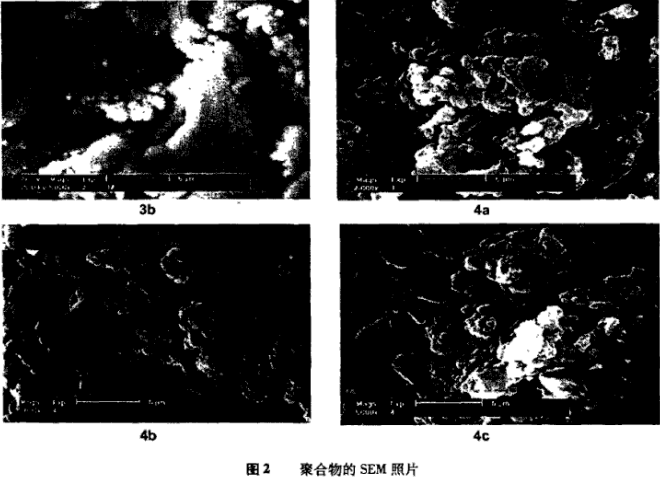 图2为5000倍率下3b和4a~4c的扫描电镜图,从图2可看出以3b呈明显的大块状,这是由于纤维素上的羟基和胺基形成强烈氢键所致。引入杯[6]冠醚单元后部分阻碍了氢键的形成,