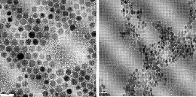 图2为实施例1所制备的纳米颗粒的透射电子显微镜图。其中左图是DMSA- Zng. Fe2. .0, NPs,右图是RGD- DMSA- -Zno. Fe2cO4 NPs.