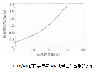 图1为AIN/ FEP热导率与AlN质量百分含量的关系。从图1可以看出,FEP/ AIN材料在AlN含量较低如10 %以下时,其热导率变化率较小;当含量超过20 %时,热导率增加率稍微变快。在本实验条件下,当AIN填充量达到30 %时,FEP/AIN材料的热导率可达2.22 W/ (m K) ,相对于纯的FEP样品﹐其热导率提高了近9倍。