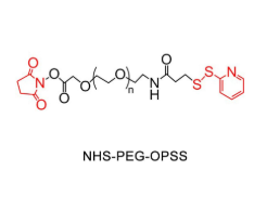 NHS-PEG-OPSS,巯基吡啶在pH 4.5~8.5范围内与自由巯基发生反应,形成的二硫键并释放吡啶环。另一端活性酯可以与氨基生成稳定的酰胺键,聚乙二醇可以增加溶解性和稳定性,降低带电分子表面非特异性结合,邻吡啶基二硫化物(OPSS)功能化聚乙二醇(OPSS-PEG)是一种具有巯基活性的PEG衍生物,可通过其巯基修饰生物分子或其它材料。邻吡啶基二硫化物与巯基反应形成稳定的二硫键,同时释放出一个巯基吡啶基。