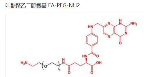 叶酸PEG胺,是具有伯胺基的反应性叶酸PEG衍生物之一。伯胺可与多种官能团反应,例如琥珀酰亚胺酯(NHS),羧酸(COOH),酸酐等。该反应使叶酸配体附着于蛋白质,抗体,肽或颗粒表面。聚乙二醇化叶酸具有相对较好的水溶性和生物活性。叶酸官能化的底物已用于靶向药物递送,成像和生物测定开发。