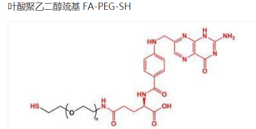 叶酸聚乙二醇巯基(FA-PEG-SH),羧基与氨基生成酰胺键,这个反应使得叶酸配体附着在蛋白质、抗体、肽或颗粒表面。聚乙二醇化叶酸具有较好的水溶性和生物活性。叶酸功能化底物已被用于靶向给药、成像和生物测定的开发。巯基与马来酰亚胺生成硫醚键,与巯基吡啶反应得到二硫键,还可以用于修饰纳米金粒子。