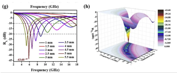 使用电纺丝和煅烧技术制造了结合rGO和磁性钴铁纳米颗粒的复合多孔碳纳米纤维膜。所生产的样品用作EMWA材料,并在宽频率范围内表现出**的吸收能力。较低的反射损耗RL值在5 mm的厚度下为-43.60 dB。磁性纳米粒子和rGO纳米片的高浓度可以增加整个复合材料的电导率,有利于吸收更多的电磁波。此外,复合材料中CNF表面的多孔结构和rGO纳米片可以产生多重反射效应,有利于电磁波衰减。这种材料在民用和军用领域都有很大的应用潜力。