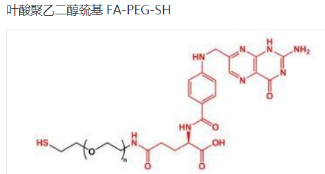 叶酸聚乙二醇巯基(FA-PEG-SH),羧基与氨基生成酰胺键,这个反应使得叶酸配体附着在蛋白质、抗体、肽或颗粒表面。聚乙二醇化叶酸具有较好的水溶性和生物活性。叶酸功能化底物已被用于靶向给药、成像和生物测定的开发。巯基与马来酰亚胺生成硫醚键,与巯基吡啶反应得到二硫键,还可以用于修饰纳米金粒子。