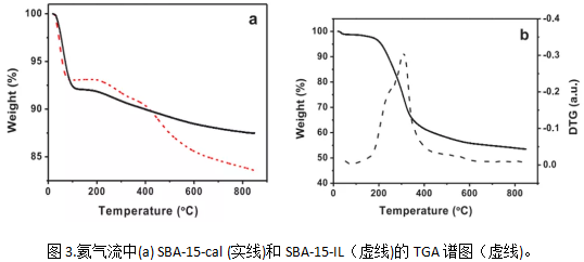 根据TGA分析,估计NH2-SBA-15-cal的胺负荷为1.4 mmol/g, NH2-SBA-15-IL的胺负荷为2.2 mmol/g。这些结果证实了SBA-15-IL上接枝的胺基比常规热模板去除样品SBA-15-cal上接枝的胺基要多。