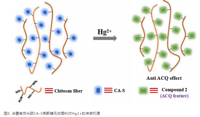 在壳聚糖无纺面料、滤纸和硅胶板上,荧光团CA-S对Hg2+的荧光响应不同。这种现象主要是由化合物2在这些底物上的不同荧光性质引起的。随后,作者通过SEM测试获得这些基底的表面结构。不同于滤纸和硅胶板中的紧密堆积单元,壳聚糖无纺面料中的纤维是松散的、交错的。此外,利用CAM-B3LYP长程修正泛函,用DFT方法研究了壳聚糖与化合物2的相互作用,优化的几何结构如图5所示。化合物2中香豆素骨架的羰基可以在壳聚糖单元的羟基和酰胺基之间形成氢键。在这里,壳聚糖单元起到了隔离化合物2分子的作用,这类似于纤维素骨架对ACQ发光体的稀释作用。如图6所示,荧光团CA-S的初始状态下显示蓝色发射。在Hg2+离子存在下,荧光团CA-S立即水解,得到具有**ACQ特征的化合物2。壳聚糖单元间隔和壳聚糖纤维的交错排列有利于防止分子间的π-π相互作用,从而引起化合物2强烈的绿色发射。