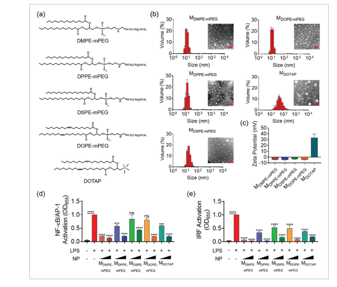 所有这些纳米胶束都能够抑制LPS诱导的NF-κB/AP-1和IRF的激活(图5d,e);研究发现,带负电荷的纳米胶束对TLR2(图S11a,支持信息)、TLR3(图S11b,c,支持信息”)和TLR7/8(图S11d,e,支持信息“)也有抑制活性,但对TLR5没有抑制活性(图S11f,支持信息。这些结果证实,脂质核纳米胶束能够抑制TLR信号传导,这种能力不取决于脂质核的表面修饰或化学性质。