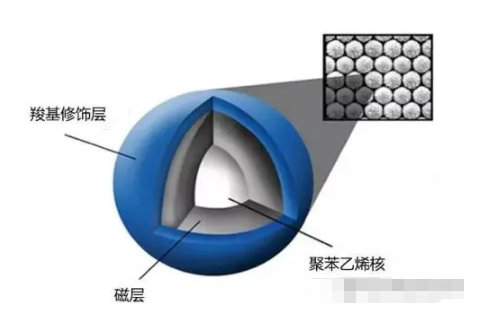 基础结构:核壳型/夹层型在(磁性聚合物微球为夹层型结构,内部为多孔聚合物微球内核,外部包覆不同材质的聚合物包层以满足不同应用需求,磁性材料填充于二者之间的孔隙中。)一般分为3层: