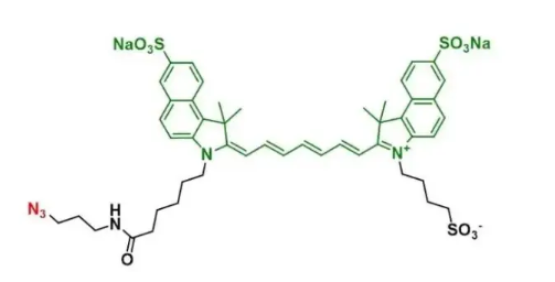 DiSulfo-ICG-azide常用的生物标记基团,作为近红外荧光染料,ICG染料比CY系列的花菁染料毒性更低,安全性更好及更的光稳定性,ICG是一种带负电荷的聚甲基菁染料,跟CY3,CY5,CY7这些菁染料不同的是他有这更高的吸收和发射波长,它的波长是800nm。