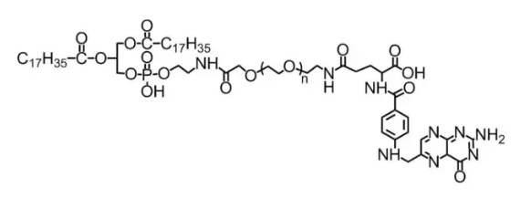 磷脂-聚乙二醇-叶酸(DSPE-PEG-FA),羧基与氨基生成酰胺键,这个反应使得叶酸配体附着在蛋白质、抗体、肽或颗粒表面。聚乙二醇化叶酸具有较好的水溶性和生物活性,叶酸功能化底物已被用于靶向给药、成像和生物测定的开发。DSPE(1,2-二硬脂酰-sn-甘油-3-磷酸乙醇胺)是一种饱和的18碳磷脂,常用于脂质体的合成。聚乙二醇(PEG)偶联DSPE具有亲水性,可用于药物传递、基因转染和生物分子修饰。