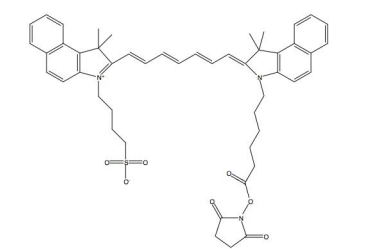ICG NHS ester是ICG染料的衍生物。ICG本身不带羧酸基团,所以不能用于生物标记实验,通过将吲哚菁绿中的一个磺酸根基团替换成羧酸基团,可以制备各种活化的吲哚菁绿,这是目前通用的吲哚菁绿染料标记方式