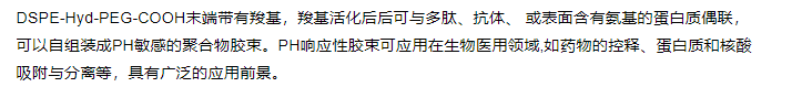 DSPE-Hyd-PEG-COOH末端带有的羧基活化后可与多肽、抗体、或表面含有氨基基团的蛋白质偶联可以自组装成PH敏感的聚合物胶束。