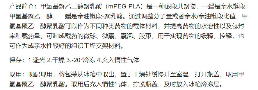 取用:现配现用,将包装从冰箱中取出,置于干燥处缓慢升至室温,打开瓶盖,取用甲氧基聚乙二醇聚乳酸。取用后充入惰性气体,拧紧瓶盖,及时放入冰箱冷冻层。