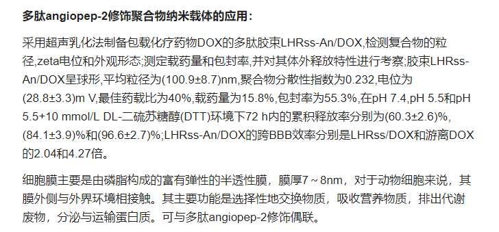 细胞膜主要是由磷脂构成的富有弹性的半透性膜,膜厚7~8nm,对于动物细胞来说,其膜外侧与外界环境相接触。其主要功能是选择性地交换物质,吸收营养物质,排出代谢废物,分泌与运输蛋白质。可与多肽angiopep-2修饰偶联。