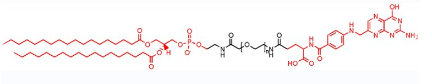 磷脂-聚乙二醇-叶酸(DSPE-PEG-FA),羧基与氨基生成酰胺键,这个反应使得叶酸配体附着在蛋白质、抗体、肽或颗粒表面。聚乙二醇化叶酸具有较好的水溶性和生物活性,叶酸功能化底物已被用于靶向给药、成像和生物测定的开发。