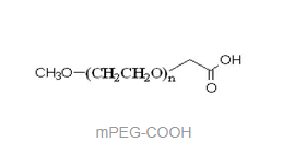 MPEG-COOH是一种羧酸(-COOH)功能化聚乙二醇衍生物,可用于修饰蛋白质、肽、颗粒和其他具有游离酸基团的材料。羧酸基容易与胺基反应,形成稳定的酰胺键。它们还可以与羟基发生反应,形成不稳定的酯键,在酸性或碱性条件下可以断裂。