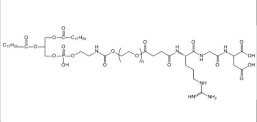 DSPE-PEG-RGD,RGD是由精氨酸(Arg)、甘氨酸(Gly)、天冬氨酸(Asp)3个氨基酸组成的序列肽,是近几年来发现的具有高生物活性的短肽序列之一。
