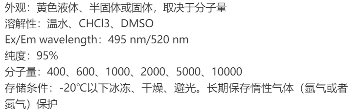 对脂质体表面行聚乙二醇(PEG)修饰后,得到长循环脂质体(Longcirculationliposome,LCL),可以延长脂质体的半衰期和提高它在血液循环中的稳定性、改变脂质体的生物学分布,并具有靶向性。荧光素修饰的PEG衍生物用于追踪黄色或黄绿色荧光。