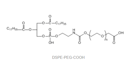 DSPE-PEG-COOH是可与伯胺基反应的反应性磷脂PEG共轭物之一。DSPE(1,2-二硬脂酰基-sn-甘油-3-磷酸乙醇胺)是一种高度疏水的18碳磷脂,另一方面,PEG接头提供良好的亲水性和水溶性。