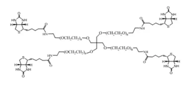 四臂PEG生物素是一种多臂PEG衍生物,四臂的每个末端都有生物素基团连接到一个季戊四醇核心。