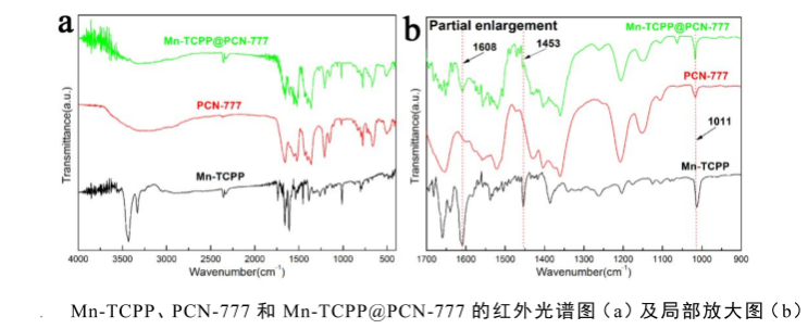 步骤二:将30.0mgMn-TCPP溶解在5mL的DMF中。然后,将200mg活化的PCN-777加入。上述溶液中。将得到的混合物在室温下搅拌12小时,并通过离心分离( 7000 rpm)收集沉淀物。将得到的带绿色的固体用DMF洗涤三次,并在真空烘箱中在100 °C下干燥12小时。