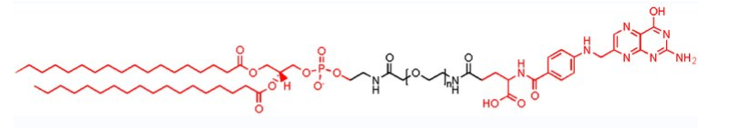 磷脂-聚乙二醇-叶酸(DSPE-PEG-FA),羧基与氨基生成酰胺键,这个反应使得叶酸配体附着在蛋白质、抗体、肽或颗粒表面。聚乙二醇化叶酸具有较好的水溶性和生物活性,叶酸功能化底物已被用于靶向给药、成像和生物测定的开发。