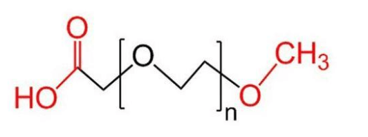 在mPEG-carboxyl中,羧酸官能团(-COOH)位于聚乙二醇链的一端或两端,提供了一种方便的反应功能基团。这使得mPEG-carboxyl可以与其他化合物进行偶联反应,形成共价键。羧酸官能团可以与氨基(-NH2)反应形成酰胺键、与羟基(-OH)反应形成酯键、与胺反应形成酰胺键等等。