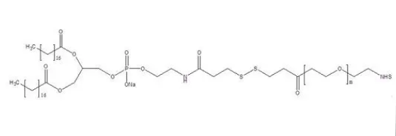 聚乙二醇磷脂是形成脂质体的材料,可用于基因转染和疫苗传递,药物运输,还可用于靶向用药。磷脂具有疏水性和亲水性。 活性酯可以与伯胺基在PH7-8.5条件下生成稳定的酰胺键。 可用于修饰蛋白类药物、肽类化合物、有机小分子药物、生物材料等。