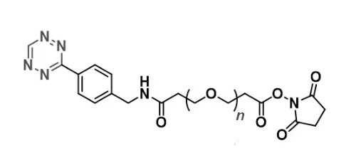 Tetrazine-PEG-NHS通过将Tetrazine与PEG-NHS反应而得到。这种化合物具有Tetrazine的反应特性和PEG的溶解性和生物相容性。