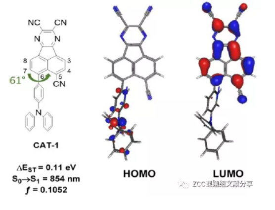 作者设计了一个简单结构的分子CAT-1,在APDC-DTPA分子的基础上用拉电子的CN基团来替换了其中一个供体。对比APDC-DTPA分子,它具有更加稳定的ICT状态,**的提升了受体强度,从而获得了一个巨大的红移。这与作者的DFT/TD-DFT (B3LYP/6-31G*)计算结果吻合。