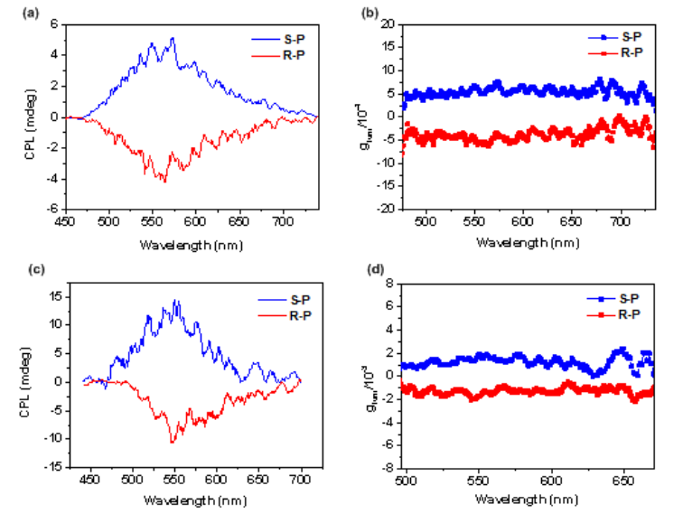 图 2 R-P与S-P在(a)(b)甲苯稀溶液中;(c)(d)mCP掺杂膜中(退火处理后)的CPL曲线图与不对称因子散点图