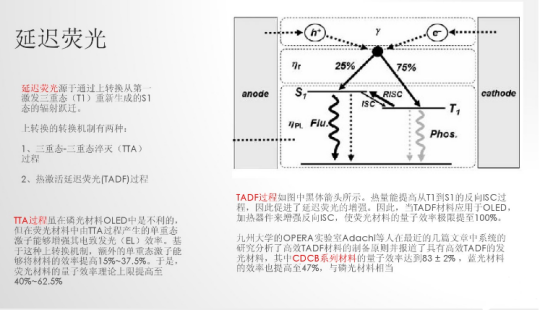 基于这种上转换机制,额外的单重态激子能够将材料的效率提高15%~37.5%。于是,荧光材料的量子效率理论上限提高至40%~62.5%。
