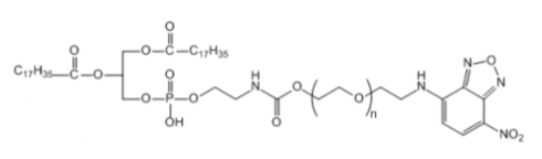 1,2-二硬脂酰基-sn-甘油-3-磷酸乙醇胺(DSPE)和NBD共轭的聚乙二醇,DSPE PEG NBD是一种荧光磷脂PEG共轭物,可用作脂质膜探针。 NBD的激发/发射波长为460 nm / 534 nm。