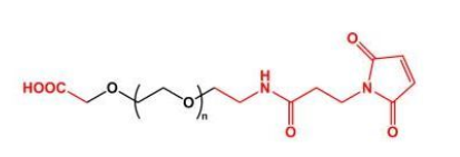 马来酰亚胺与硫醇之间的反应在pH 6.5〜7.5时容易进行,形成稳定的硫醚键。 羧基(-COOH)可以被活化,和胺,羟基和其他官能团反应。羧基和马来酰亚胺中间以PEG链接,具有较好的水溶性。