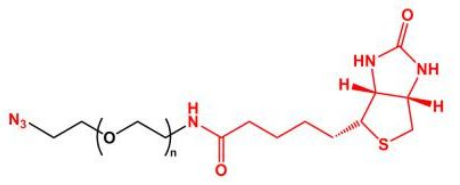 在铜催化剂催化下,叠氮可以与炔基在水溶液中发生click环化反应,生成含氮五元杂环。 生物素可以很容易被检测,链霉亲和素结合法是广泛使用的分子靶点检测。修饰性PEG应用于修饰蛋白类**、肽类化合物、有机小分子**、生物材料等。