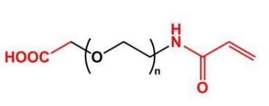 丙烯酸酯基团可以通过丙烯酸化聚合反应与其他包含丙烯酸酯的分子或材料快速反应。 该反应可以使酸性PEG快速附着到改性材料表面。 该分子上的羧基可以被激活与胺或羟基反应。 聚乙二醇化可提高改性材料的溶解度和稳定性。 它还可以**带电分子与修饰表面的非特异性结合。
