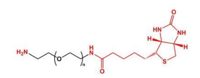 氨基PEG生物素(NH2-PEG-Biotin)是异双功能PEG衍生物之一,在一个PEG末端具有生物素标签,在另一个PEG末端具有伯胺基。氨基容易与琥珀酰亚胺酯(NHS),活化的羧基(-COOH),醛基和许多其他官能团反应
