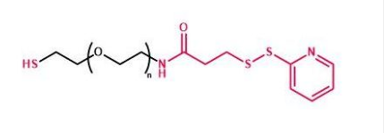 SH-PEG-OPSS是一种杂化双功能聚乙二醇交联剂,具有巯基反应基团和巯基,由一个线性PEG链连接,巯基吡啶,在pH 4.5~8.5范围内与自由巯基发生反应,形成二硫键。
