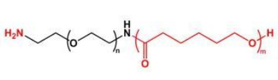 NH2-PEG-PCL是由亲水性嵌段聚乙二醇(PEG)和疏水性嵌段聚己内酯(PCL)组成的两亲性AB二嵌段共聚物。PEG聚合物被氨基封端,可以和其他胺反应性化学基团修饰蛋白质,肽和其他材料。疏水性嵌段的末端为羟基。具有可生物降解和生物相容性聚酯链段的聚乙二醇化共聚物还可用于制备核-壳胶束,纳米颗粒和微球。