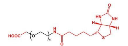 生物素是通常用于靶向并结合抗生物素蛋白或抗生蛋白链菌素的生物活性分子。羧酸基团可以用许多偶联剂活化,以与胺或羟基反应。来自羧酸的反应可以使生物素标签与各种生物分子(例如蛋白质,抗体或颗粒)结合。 生物素和羧基之间的PEG接头具有更好的水溶性,灵活的接头结构和较强的稳定性。 聚乙二醇化的生物素显示出对亲和素或链霉亲和素的高结合亲和力,它们可用于生物测定开发,细胞成像或**递送。