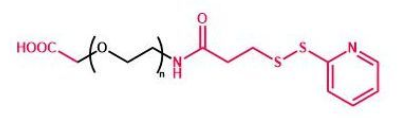 羧基PEG巯基吡啶(COOH-PEG-OPSS)是异双功能PEG衍生物之一,可用于修饰蛋白质,肽和其他材料。羧甲基可用于通过氨基或其他酸反应性化学基团修饰蛋白质,肽和其他材料;邻吡啶二硫醚(OPSS)功能化的聚乙二醇(OPSS PEG)是硫醇(-SH)基反应性PEG衍生物,可用于通过其可用的硫醇基团修饰生物分子或其他材料。邻吡啶基二硫键与巯基反应形成稳定的二硫键,同时释放巯基吡啶基。
