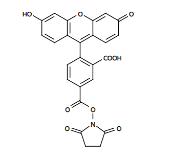 5-Carboxyfluorescein, succinimidyl ester,Molecular weight:473.39,Excitation (nm):493,Emission (nm):517,Extinction coefficient (cm-1 M-1):83000