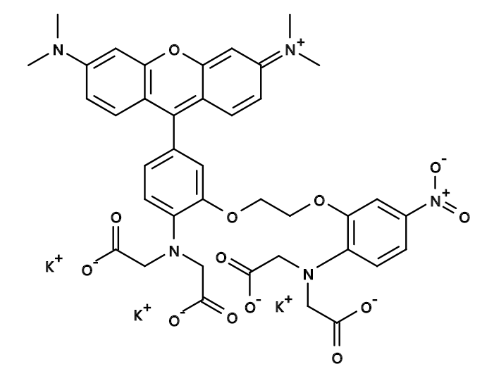 西安齐岳生物科技有限公司生产销售“Rhod-5N, tripotassium salt|钙离子荧光探针Rhod-5N, 三钾盐”“分子量:900.02,激发(nm):557,发射(nm):580,Rhod-5N对Ca2 +的结合亲和力较低(Kd =〜320 µM),适用于10 µM至1 mM的Ca2 +测量。”,该产品仅用于科研,如果需要请联系我们