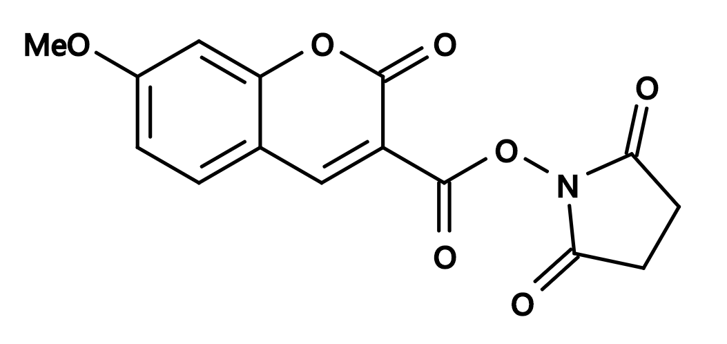 西安齐岳生物科技有限公司生产销售“7-Methoxycoumarin-3-carboxylic acid, succinimidyl ester|CAS150321-92-9|7-甲氧基香豆素-3-羧酸, 琥珀酰亚胺酯”“分子量:317.25,激发(nm):355,发射(nm):405,7-甲氧基香豆素-3-羧酸琥珀酰亚胺酯是一种出色的氨基反应标签,具有强烈的蓝色荧光。它用于标记肽,核苷酸。尽管它的荧光波长很短,但它也用于标记细胞膜。”,该产品仅用于科研,如果需要请联系我们