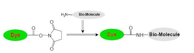 琥珀酰亚胺酯(SE或NHS)已被证明是**的氨基修饰试剂,因为它与氨基形成的酰胺键与天然蛋白中的酰胺键一模一样。Dye-SE与脂肪胺具有很高的反应活性。更多详情见——羧酸荧光染料及其琥珀酰亚胺酯