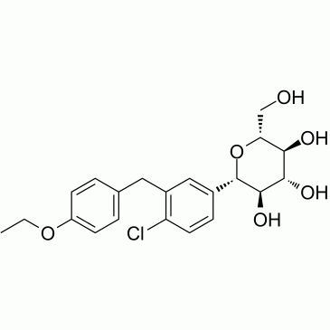 分子式:C21H25ClO6,分子量:408.87,纯度: > 98%,溶解性: (R.T.: 25℃): DMSO,Dapagliflozin (BMS-512148) 是一种竞争性葡萄糖协同转运蛋白2 (SGLT2) 制剂